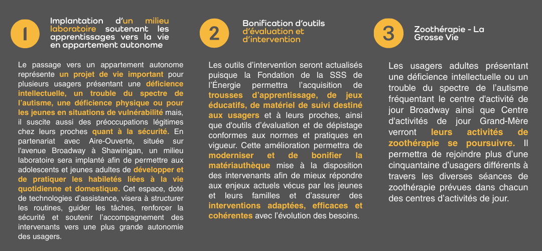 Ce projet d’envergure vise à soutenir le développement de l’autonomie, le bien-être et la participation sociale des usagers. Il se divise en trois volets qui misent sur l’innovation, la modernisation des pratiques et des approches reconnues afin d’offrir des services concrets, adaptés et porteurs d’impact durable pour les usagers, de l’adolescence à l’âge adulte.